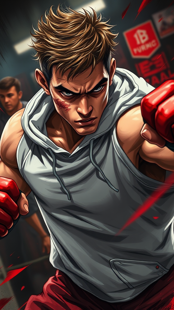 Illustration of a muscular young man with short brown hair, a tough and intense gaze, and strong, calloused hands wearing a white dragon hoodie. He appears as a seasoned fighter, with scars and battle marks on his face and body, glistening with sweat. Captured in a blur of speed and dynamic action pose, the setting is a dark boxing club during a fierce battle. Painted in Prokoko style, with bold, expressive brushstrokes and vivid colors. The background is rich and atmospheric, while the color scheme leans towards blood red. Lighting is cinematic, casting dramatic shadows and highlights, emphasizing the extreme details. The angle is dynamic, adding to the intensity and epic nature of the scene, infused with CarnageStyle elements for added depth.