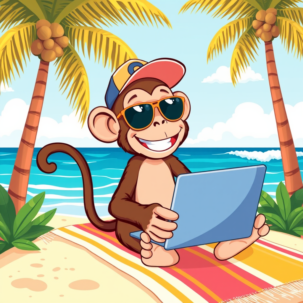 Illustration of a playful monkey wearing sunglasses and a cap, sitting on a vibrant beach towel with a laptop, surrounded by palm trees and ocean waves, enthusiastically coding AI applications. The scene is depicted in a vector style with bright, lively colors, showcasing the monkey's curiosity and tech-savvy nature amidst a tropical paradise setting.
