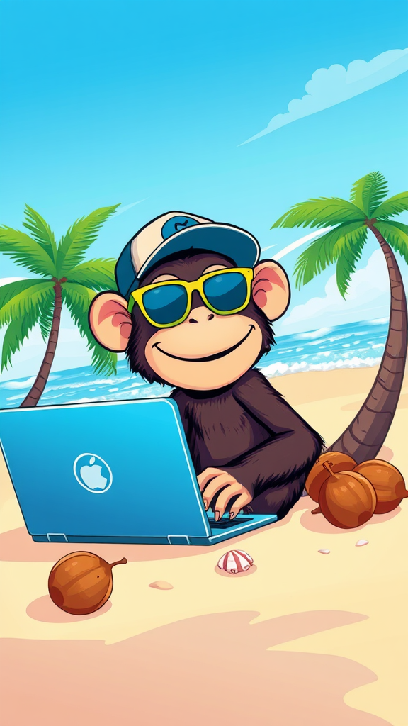 Illustration of a playful monkey wearing sunglasses and a cap, sitting on a sandy beach beside a laptop, designing colorful AI applications. The scene is vibrant with bright colors, a clear blue sky, and gently crashing waves in the background. Palm trees sway nearby as the monkey types enthusiastically, surrounded by coconuts and seashells.