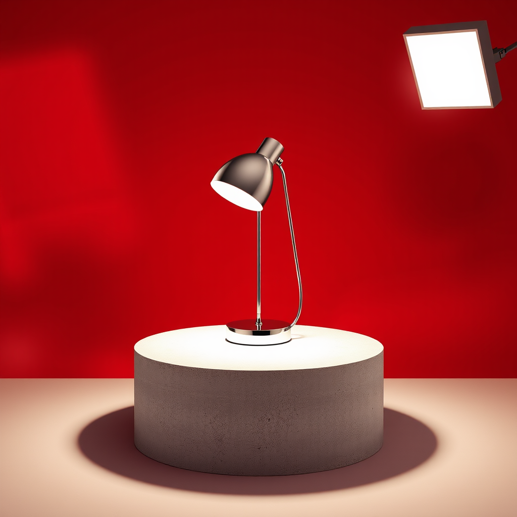 Illustration of a retro pop art inspired scene featuring a Louis Poulsen Panthella 250 table lamp, crafted in chrome with a sleek and reflective finish. The lamp is positioned on a concrete cylinder podium in a photo studio setting. The backdrop is a deep foggy red, enhanced by studio lighting that accentuates the contrast. A square soft box provides illumination, simulating realism akin to golden hour sunlight, casting shadows reminiscent of window frames. The lamp's optimal shape and photorealistic detailing are emphasized in 8K UHD resolution. The perspective view captures the essence of the design while allowing for small creative twists that enhance the theme, avoiding any strange shapes or unnecessary details, lending focus to its thin line elegance.