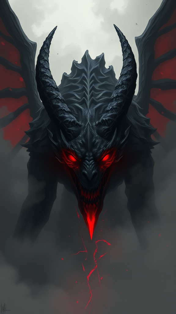 Illustration of a sinister demon with glowing red eyes amidst a swirling, dark gray and crimson color palette, inspired by Jessica Rossier. Strong use of negative space contrasts against intricate dragon-like features, evoking a sense of foreboding. Hazy atmospheres envelop the scene, reminiscent of Brandon Woelfel's ethereal style, enhancing the mysterious aura. The dark figure looms tall, blending seamlessly with the smoky background, its presence unsettling yet artistically captivating.