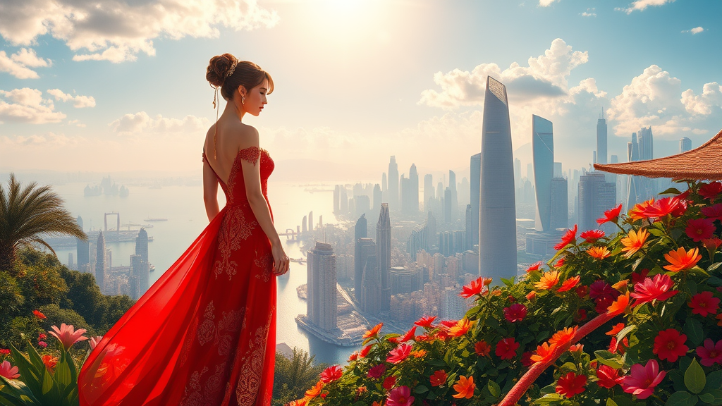 Illustration of a stunning cityscape featuring towering skyscrapers and idyllic islands, rendered in bright, vivid colors under the gleam of sunlight. A golden-hued woman adorned in a red dress with intricate gold embellishments stands gracefully, embodying a maximalist aesthetic. The scene, trending on art platforms, includes a lush garden in a breezy atmosphere filled with vibrant flowers. A circular perspective captures the cinematic beauty of the scene. This artwork is 2D, capturing the essence of elegance and wonder.
