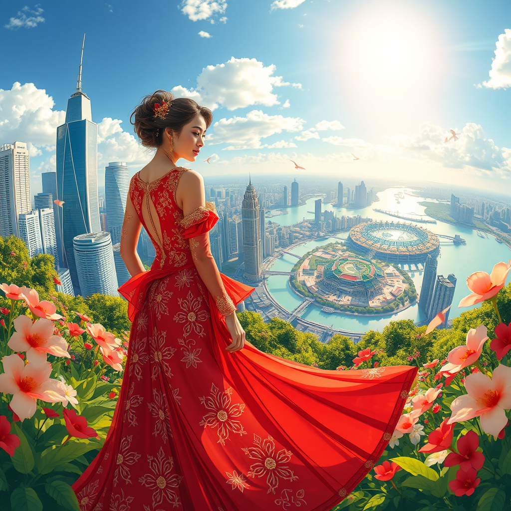 Illustration of a stunning cityscape with soaring skyscrapers and vibrant islands, bathed in bright sunlight. A woman adorned in a red dress with intricate gold embellishments stands out in a maximalist style. The scene is set within a lush garden, flowers dancing in the wind, capturing beauty from a circular perspective. The cinematic illustration trends on art platforms, exuding elegance and creativity.
