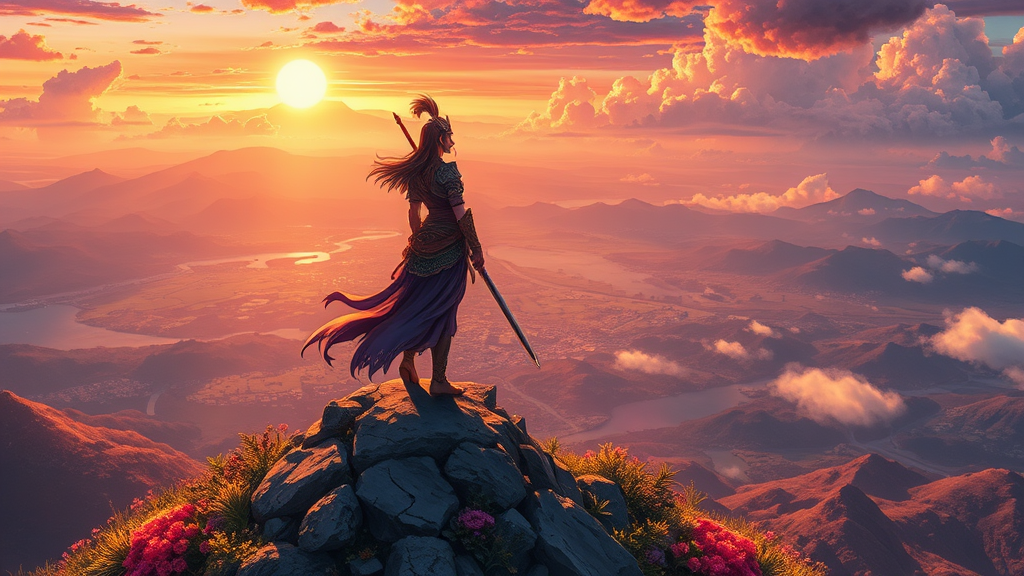 Illustration of a warrior goddess standing proudly atop a hill, centered amidst a vast landscape, depicted in a striking anime style. The scene serves as a key visual, bursting with intricate and breathtaking detail, showcasing a vibrant and panoramic view. The cinematic composition echoes the signature styles of Carne Griffiths, Conrad Roset, and Makoto Shinkai, with refined artistry that captures both power and grace. The atmosphere is vibrant, drawing the viewer into a world where the divine meets the earthly, portrayed with a compelling blend of color and light.