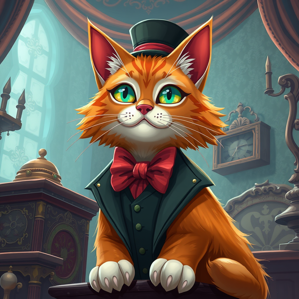 Illustration of a whimsical gentleman cat in 2D game art style, featuring a vibrant palette of cyan and orange hues. The scene presents a necropunk aesthetic with intricate tapestries and wooden elements, evoking fancy and ornate vibes. The cat exudes charm and sophistication, and the overall composition is rich in detail, capturing a playful yet elegant ambiance reminiscent of a fairy tale. Ultra-high definition 32k resolution, with a touch of creative chaos, encapsulating the spirit of a fantastical, otherworldly narrative.