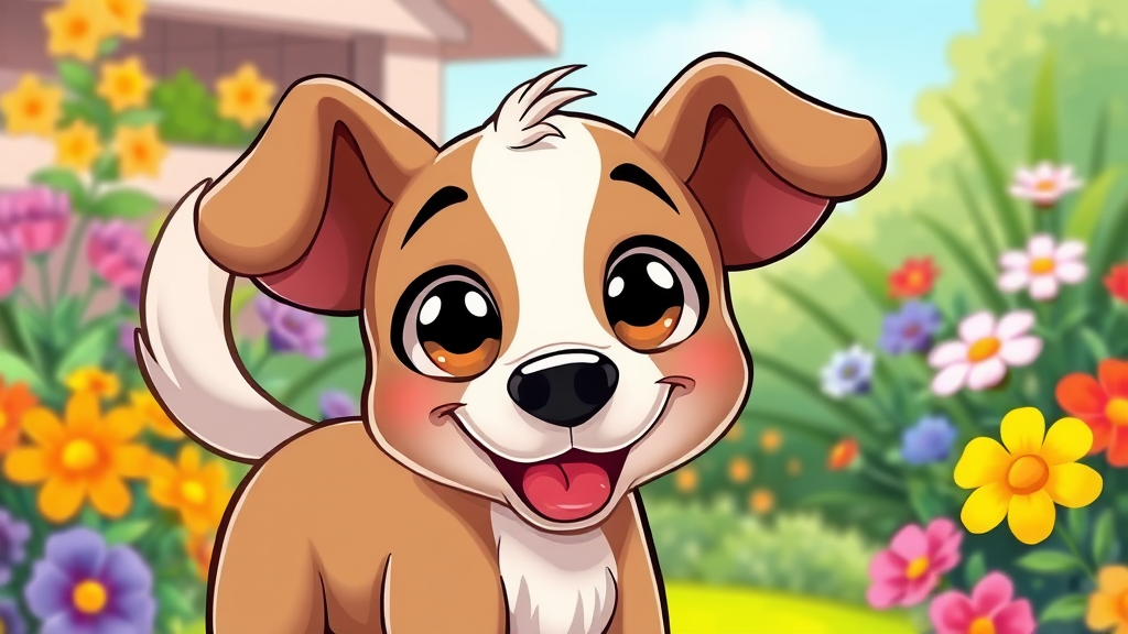 Illustration of an adorable, cartoon-style dog with big, bright eyes and floppy ears, joyfully wagging its tail while looking directly at the viewer. The dog is surrounded by a colorful garden, adding to the cheerful and playful atmosphere.