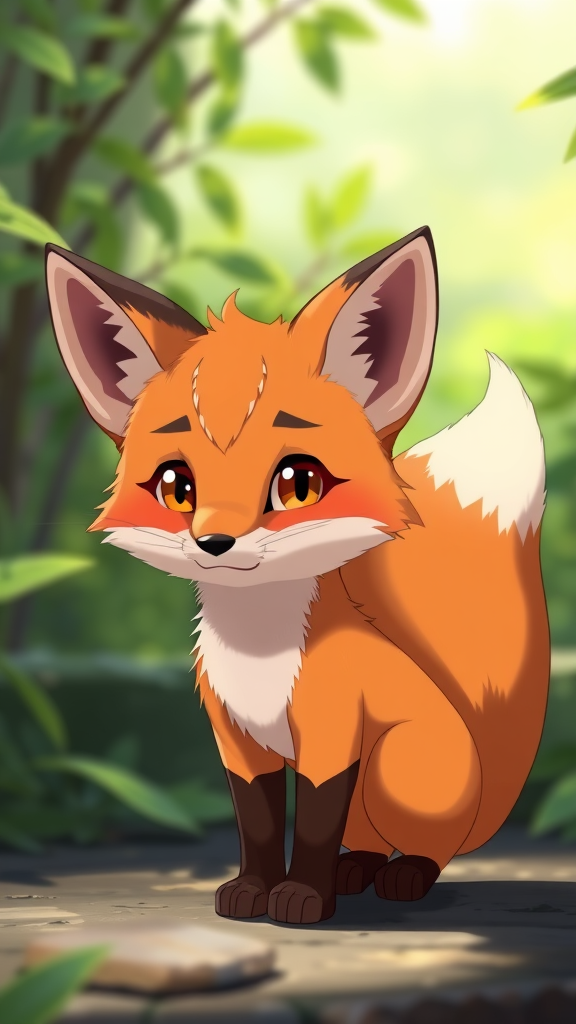 Illustration of an anime timid young fox with a soft orange fluffy tail, exuding a shy demeanor, designed with the style of Production I.G. Features earthy tones, created using 3ds Max and V-ray, set against a serene backdrop of lush greenery. The fox's curious eyes peep through its furry brow, adding an endearing touch to its cautious stance, capturing a sense of innocence and wonder.