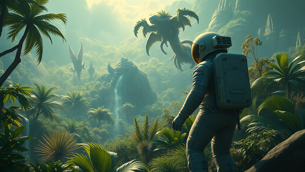 Illustration of an astronaut exploring a lush, green alien landscape; a breathtaking sci-fi masterpiece with atmospheric elements, featuring highly detailed flora and fauna, all in sharp focus and intricate composition. The image is rendered in 4k resolution, capturing a scene worthy of trending on Artstation, with subtle creative embellishments enhancing the richness and mystery of this vibrant world.