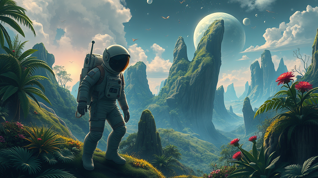 Illustration of an astronaut exploring a lush, verdant alien landscape, a masterful sci-fi scene with atmospheric elements, showcasing highly detailed and intricate foliage and terrain in sharp focus, rendered in 4k resolution, with vibrant colors and dynamic lighting that creates an immersive trending composition on artstation, enhanced with embellishments adding surreal elements in the foreground and sky, capturing both the wonder and mystery of this new world.
