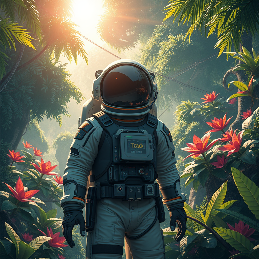 Illustration of an astronaut exploring a lush, verdant world, capturing a masterpiece of sci-fi atmosphere with highly detailed and intricate landscapes. The scene is rendered in sharp focus, showcasing vibrant foliage and alien flora in stunning 4k resolution. The sunlight filters through dense canopies, casting ethereal patterns of light and shadow. This artwork is designed to trend on ArtStation, featuring embellishments of futuristic technology integrated into the astronaut’s gear, blending seamlessly with the environment. The overall composition evokes a sense of wonder and discovery in this otherworldly paradise.
