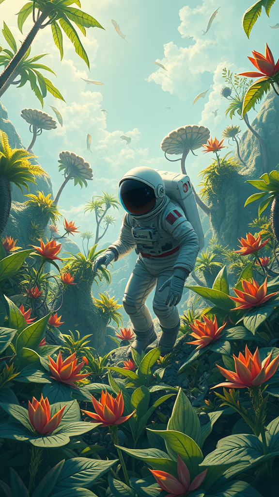 Illustration of an astronaut exploring a lush, verdant alien landscape, featuring intricate and highly detailed plant life, atmospheric sci-fi ambiance, with sharp focus and breathtaking clarity in 4k resolution, capturing the essence of discovery and wonder, inspired by trending art styles on platforms like ArtStation, showcasing vibrant colors and imaginative flora, inviting viewers to envision untold stories and distant worlds.