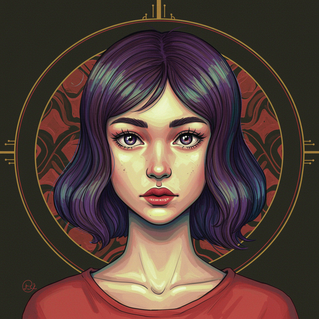Illustration of an upper-body portrait featuring a girl facing forward with a captivating gaze, utilizing two to three randomly chosen colors for emphasis. The image is defined by clear outline and edge lines. The background showcases an intricate pattern, creating a sense of depth. This original masterpiece captures the essence of raw artistic style and vivid creativity.