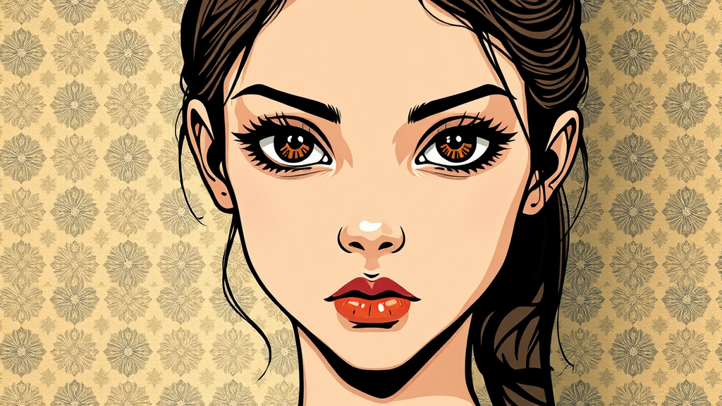 Illustration of an upper-body portrait of a girl facing forward, her gaze captivating and intense. She features only two to three colors, applied in a dynamic, restricted palette. Thick outlines and sharp edge lines define her features, with a backdrop adorned with a unique pattern, adding depth and intrigue. The artwork embodies originality and a raw artistic style, capturing a true masterpiece essence in its simplicity.