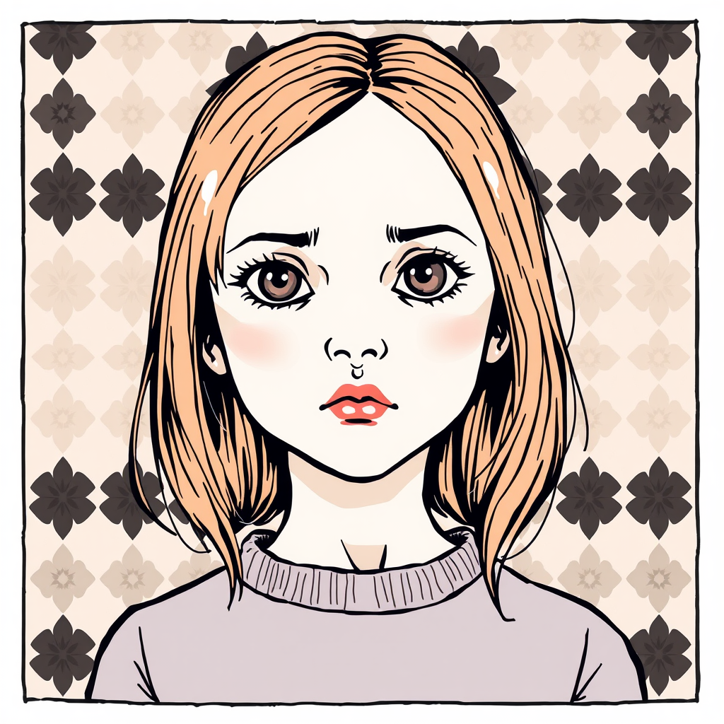 Illustration of an upper-body portrait of a girl facing forward, her eyes gazing intently. The design employs two to three randomly chosen colors with distinct outlines and edge lines, set against a patterned backdrop. The artwork is an original masterpiece, capturing raw emotional depth and creativity.