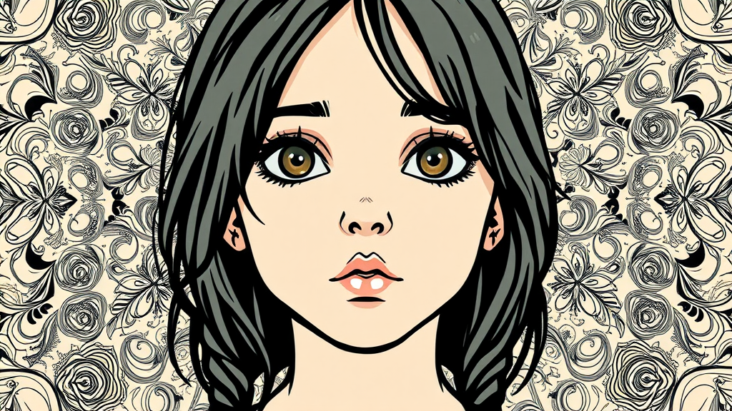 Illustration of an upper-body view of a girl seen from the front, her face displaying a captivating gaze. The image is crafted using a palette limited to two or three random colors, featuring bold outline and edge lines. The background is adorned with a complex pattern, emphasizing originality and creating a masterpiece with raw artistic style, inspired by --ar 9:16 --stylize 300.
