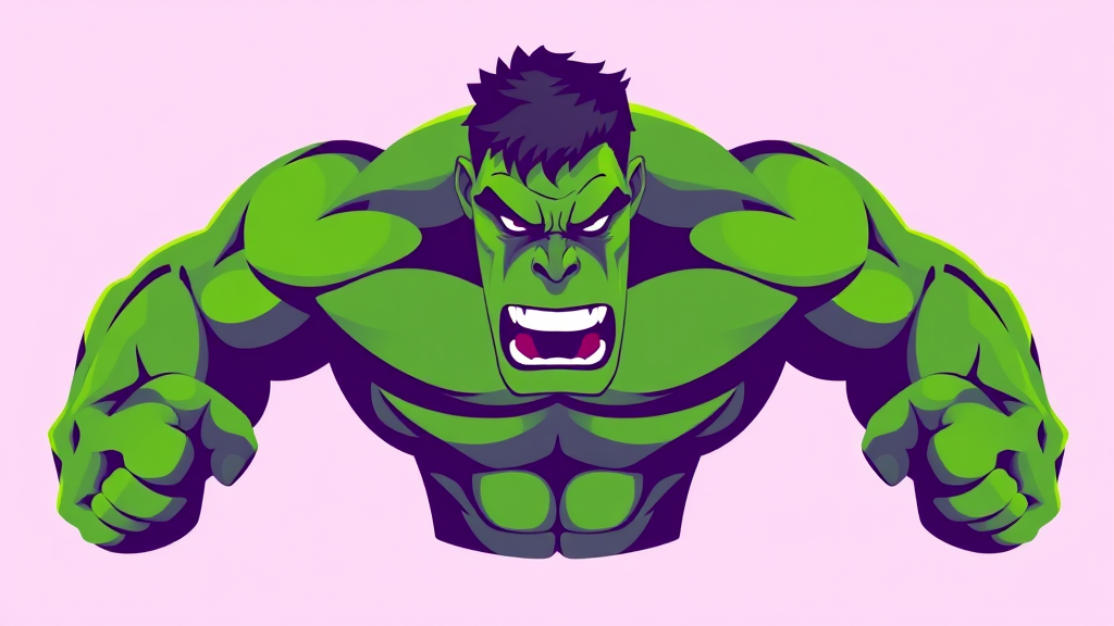 Illustration of Hulk in a symmetrical, minimalist style, flat icon design with bold green and purple hues, exaggerated muscular features, fierce expression, subtly updated with modern graphic aesthetics and smooth outlines.