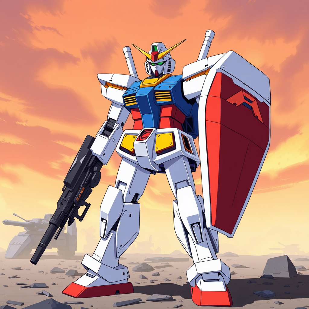 Illustration of RX-78-2 Gundam featuring its iconic shield and weapon, reimagined in a tall, dynamic pose with an anime style reminiscent of Kunio Okawara's original designs from Mobile Suit Gundam. The Gundam stands majestically against a futuristic battlefield backdrop, with enhanced armor detailing that highlights its robust construction. The color palette remains classic with blue, red, and white, but features subtle gradient enhancements to reflect a modernized look. The shield is slightly larger, providing an imposing presence, while the beam rifle includes intricate embellishments, suggesting advanced technology. Despite modifications, the RX-78-2's noble stature and powerful aura are preserved, embodying the essence of a legendary mobile suit in a vibrant anime aesthetic.