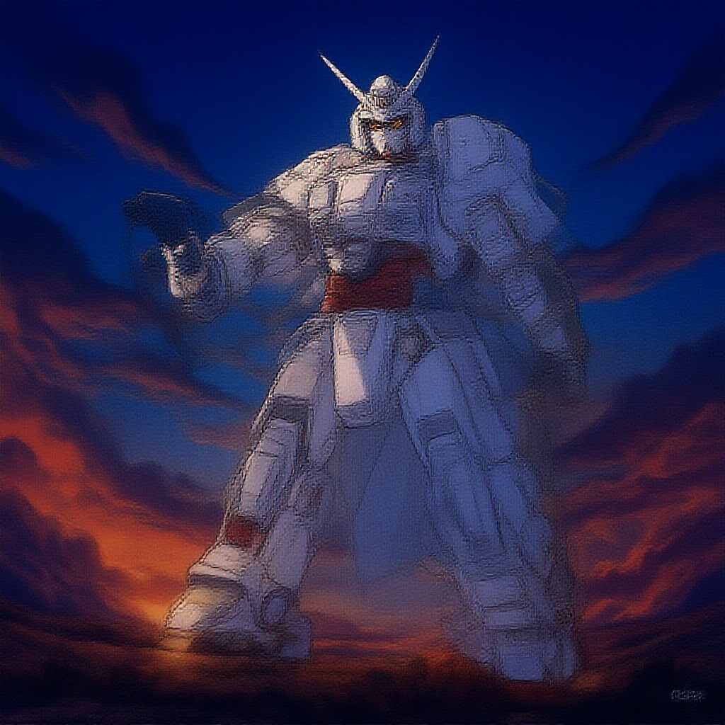 Illustration of RX-78-2 Gundam standing in a heroic pose, wielding its signature beam rifle in one hand and a large shield in the other, in the distinctive art style of Kunio Okawara, capturing the classic anime essence of Mobile Suit Gundam. The Gundam's armor features intricate panel lines and subtle modifications, such as enhanced shoulder details and a more streamlined helmet design. Its gleaming white armor contrasts with the vibrant blues and reds, set against a dramatic sky of swirling clouds. The setting sun casts long shadows, highlighting the mechanical intricacies of the Gundam with a warm glow, evoking a sense of power and readiness for battle.