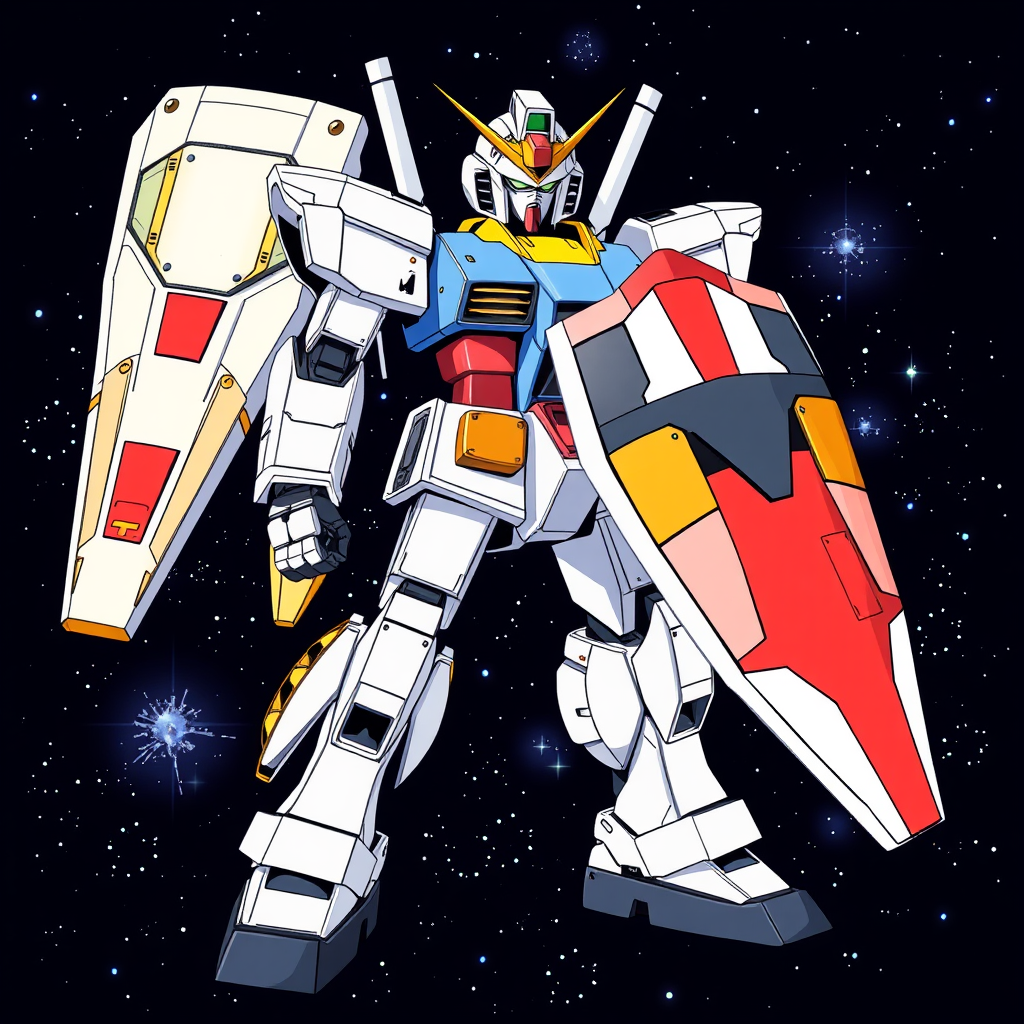Illustration of RX-78-2 Gundam standing proudly with its iconic shield and beam rifle, in the dynamic style of Kunio Okawara, inspired by classic anime, Mobile Suit Gundam. The Gundam strikes a heroic pose set against a starry cosmic backdrop, with creative modifications such as subtle golden accents on its armor and a slightly larger V-fin on its head, maintaining the machine's powerful and majestic appearance while capturing the adventurous spirit of space exploration, using a vibrant color palette that brings the timeless design to life.
