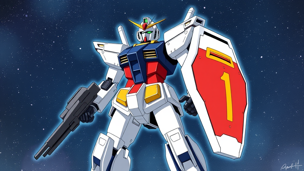 Illustration of RX-78-2 Gundam standing valiantly with its iconic shield and beam rifle, designed in the style of Kunio Okawara from the anime Mobile Suit Gundam, featuring sleek mechanical lines and vibrant colors. The Gundam is set against a celestial backdrop, giving an epic sense of scale, with small creative modifications such as a subtle hint of luminescent accents on the armor and a more dynamic pose that suggests readiness for action. The illustration maintains the essence of the original design while introducing a slight gust of cosmic wind gently lifting the Gundam's cloak-like antenna shroud, creating an engaging and fresh interpretation.