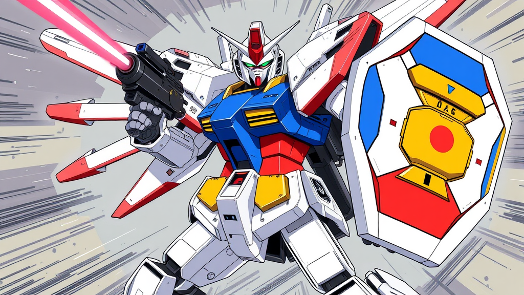 Illustration of RX-78-2 Gundam wielding its iconic shield and beam rifle, depicted in the signature style of Kunio Okawara with vibrant anime aesthetics, showcasing detailed mechanics and intricate design elements. Set against a dynamic background with a sense of motion, the Gundam's armor displays subtle creative modifications like enhanced panel lines and unique color accents while maintaining its recognizable silhouette and form, evoking the nostalgic essence of Mobile Suit Gundam in a stylized, imaginative way.