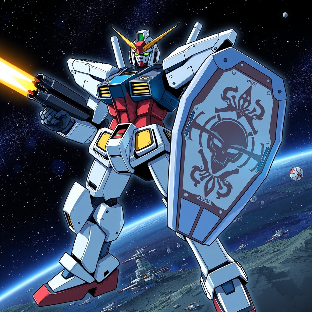 Illustration of RX-78-2 Gundam with shield and weapon, designed in the style of Kunio Okawara, featuring dynamic anime aesthetics from Mobile Suit Gundam. The mech stands poised with its signature beam rifle and shield, set against a backdrop of a starry space battlefield. The armor has intricate paneling with a subtle metallic sheen, while the iconic v-fin helmet glows softly. The shield carries visible battle scars with creative markings inspired by ancient armor designs. The overall posture is heroic, exuding both power and agility, with a slight artistic flair reflected in exaggerated proportions of the limbs, maintaining its iconic essence.