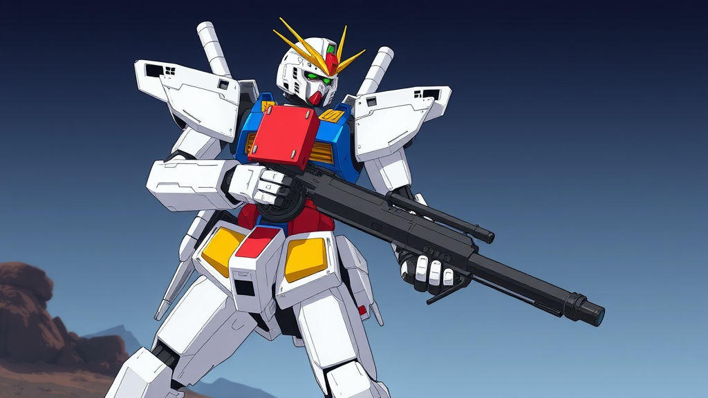 Illustration of the RX-78-2 Gundam, featuring its iconic shield and beam rifle, designed in the distinctive style of Kunio Okawara from the anime Mobile Suit Gundam. The Gundam is posed in a dynamic stance, ready for battle, with subtle enhancements like a slightly sleeker design and additional detailing on the armor for a more modern aesthetic. The color scheme retains its classic white, blue, red, and yellow palette, while the backdrop hints at a futuristic landscape, echoing the expansive universe of the original series, capturing the essence and spirit of the iconic mobile suit with a touch of creative flair.
