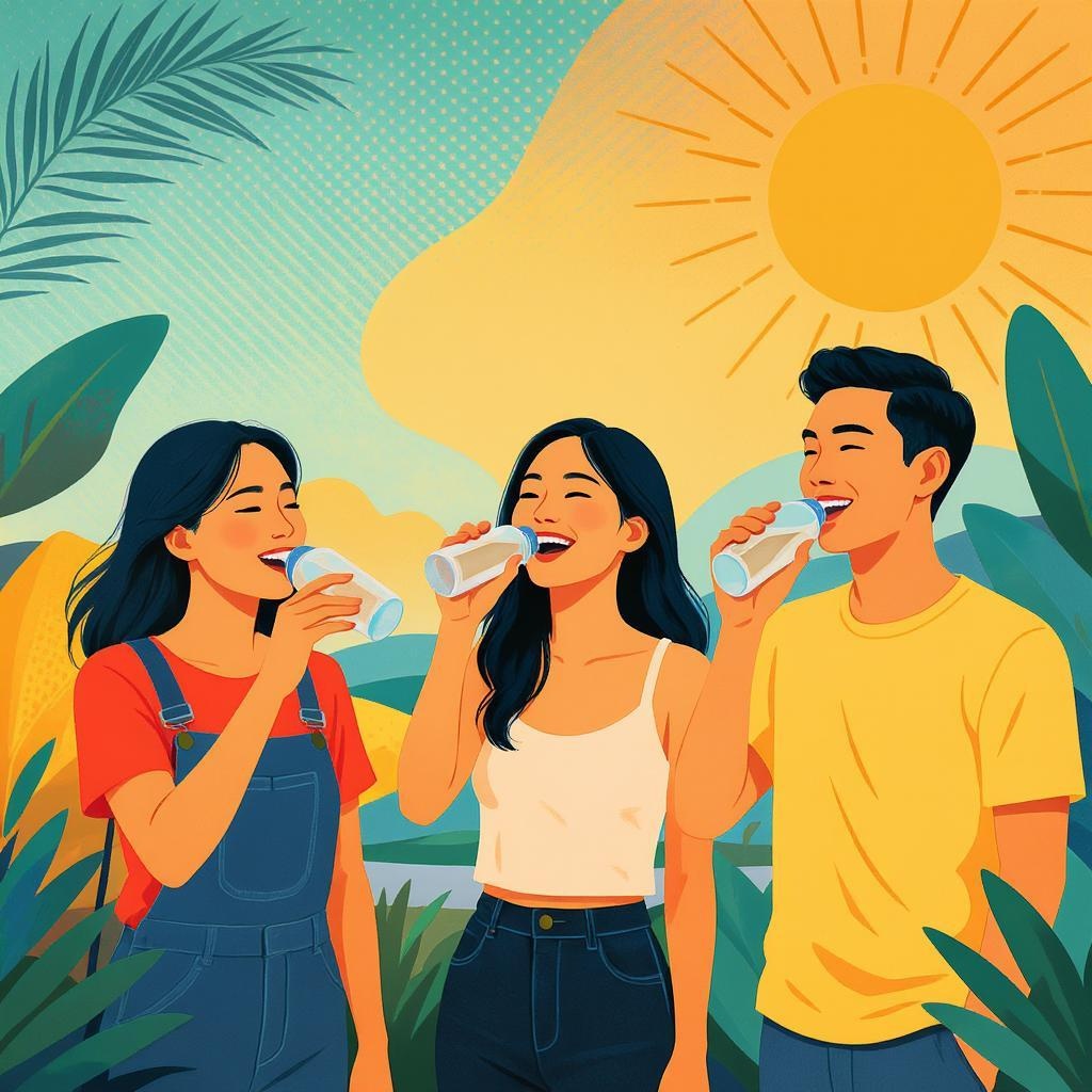 Illustration of three Asian friends, two women and one man, joyfully sipping beverages from PET bottles, positioned in the lower right corner against a vibrant backdrop. The scene is colorful and panoramic, created in a minimalist style with vector-like precision, offering high resolution and intricate details. The friends are surrounded by abstract, playful patterns hinting at a breezy outdoor setting, capturing a moment of carefree enjoyment while subtle gradients in the background enhance the depth and add a touch of modern elegance.