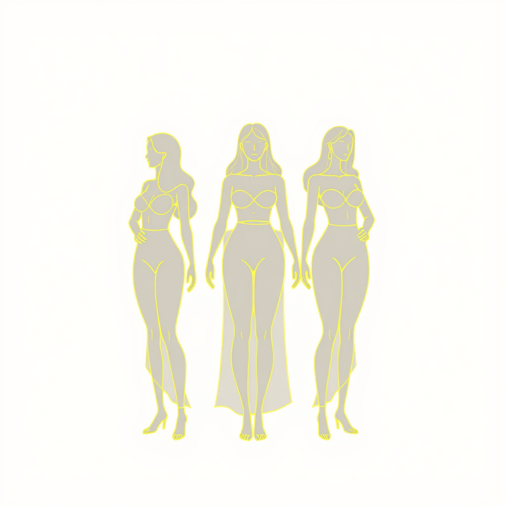 Illustration of three women with delicate yellow outlines, standing gracefully against a minimalist background, capturing a sense of unity and strength, designed in a tall 9:16 aspect ratio.