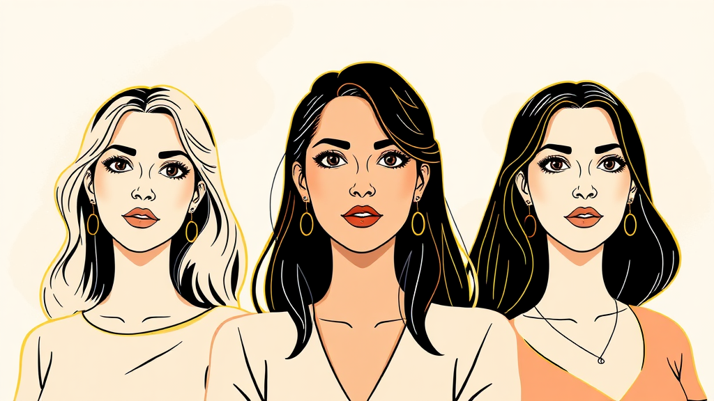 Illustration of three women with subtle yellow outlines, depicted in a vertical 9:16 aspect ratio, with each woman having distinct expressions and styles, set against a soft, abstract background that enhances their presence.