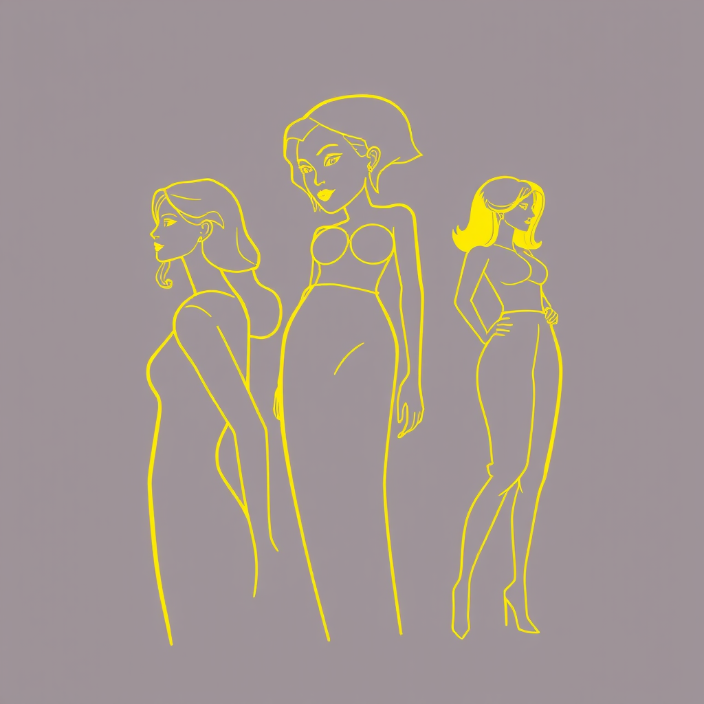Illustration of three women with vibrant yellow outlines, set against a tall, slender 9:16 composition, where the figures are gracefully interwoven, each embodying unique styles and expressions that highlight their individuality.