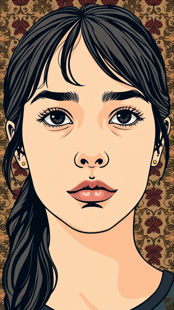 Illustration of upper-body portrait of a girl facing forward, her gaze fixed, with a focus on the face. Utilize a palette of two to three random colors to form the image, emphasizing outlines and edge lines. Integrate a unique pattern backdrop to enhance the original design, resulting in a raw masterpiece with an aspect ratio of 9:16.