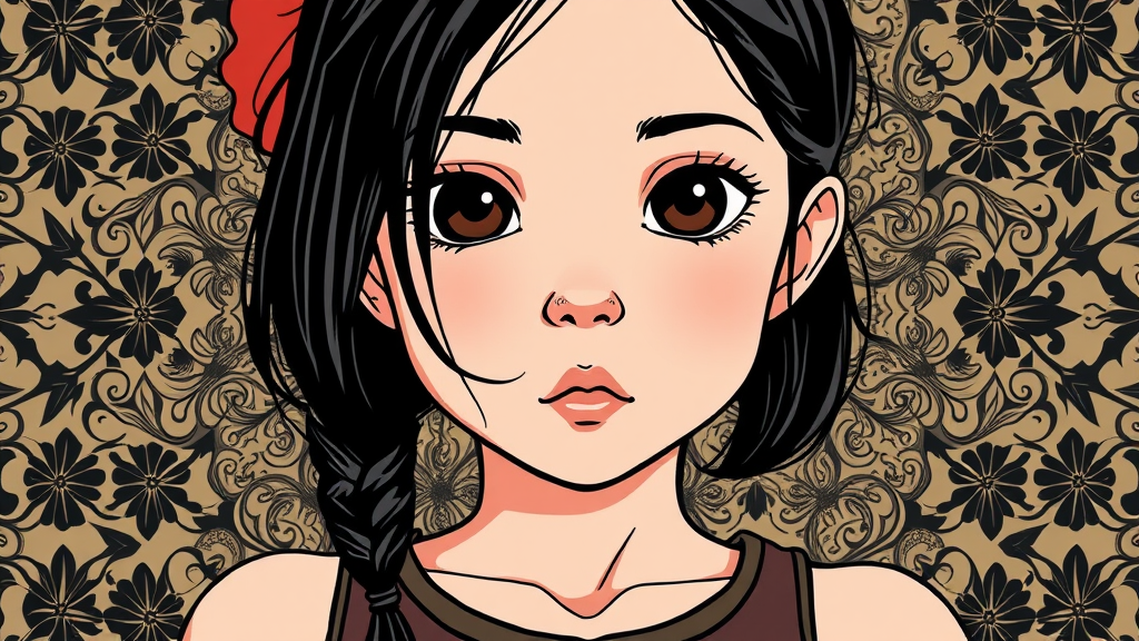 illustration, portrait of a girl, upper-body focus, facing front, expressive gaze, limited palette of two to three random colors, defined outlines and edge lines, intricate pattern backdrop, unique and original design, artistic vision, raw style, heightened stylization