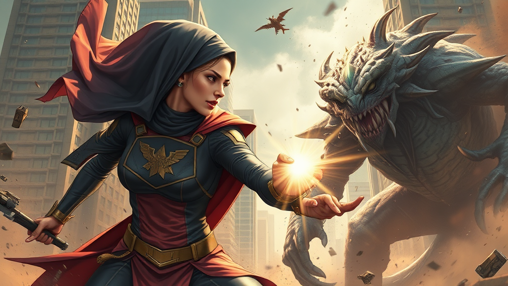 Illustration portrait of a super hero woman in a dynamic fight against a monster, set against an epic cinematic background. The scene captures the unique features of the Muslim woman hero, her fierce expression, and the intricacies of her costume. She is in a powerful pose, conveying her agility and strength amidst an urban battlefield with towering buildings. The menacing monster stands with a formidable presence, characterized by monstrous anatomy. Dramatic lighting with strategic shadows and highlights accentuates the mood, while cinematic effects like motion blur, debris, and energy trails enhance the sense of movement and action. The composition uses leading lines to focus on the hero and monster, while detailed costume design incorporates emblematic symbols of her persona and powers. Atmospheric elements like swirling dust, billowing smoke, and dynamic weather add to the dramatic impact. The color palette reflects the scene's mood, whether vibrant or gritty, ultimately evoking a sense of epicness and capturing the intensity, strength, and determination of the super hero woman.