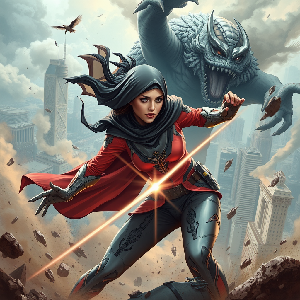 Illustration portrait of a superhero woman engaged in an epic battle with a monster, set against a sprawling urban landscape with towering buildings. The focus is on a super hero Muslim woman in a dynamic pose that conveys power and agility, capturing her unique features and intricately designed costume, complete with emblematic symbols representing her persona and powers. The scene is infused with a battlefield atmosphere, characterized by swirling dust, billowing smoke, and dynamic weather effects to enhance the dramatic impact. The monster is depicted with menacing features and a formidable presence, contributing to the sense of scale and intensity. Dramatic lighting, with shadows and highlights, accentuates the mood, while cinematic effects like motion blur, debris, and energy trails add movement and action. Leading lines and framing techniques guide the viewer's focus to the central characters, emphasizing the battle's epic nature. A carefully chosen color palette reflects the mood and tone, whether vibrant and dynamic or dark and gritty, creating an artwork that evokes a sense of epicness and determination in the superhero Muslim woman amidst the awe-inspiring spectacle of the fight.