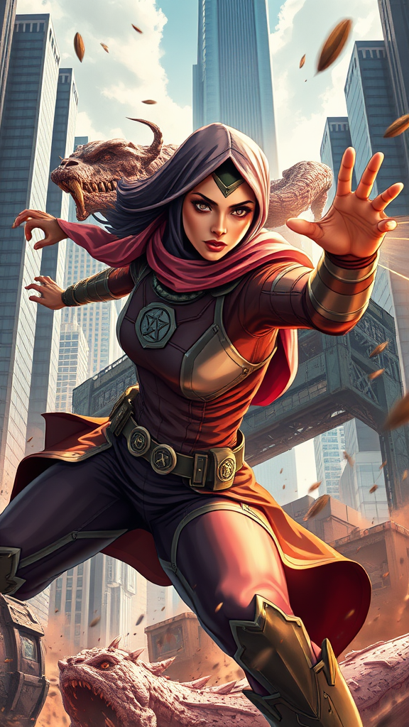 Illustration portrait superhero woman battling a monster in an epic cinematic scene. Detailed portrait of a heroic Muslim woman, showcasing her unique features and intricately designed costume, complete with emblematic symbols representing her powers. Captured in a dynamic pose radiating power and agility amidst an epic urban battlefield. Towering skyscrapers create a sprawling backdrop, emphasizing the scale of the confrontation. The monstrous adversary is depicted with menacing anatomical features, exuding a formidable presence. Dramatic lighting accentuates the scene's intensity with strategic shadows and highlights. Motion blur, debris, and energy trails enhance the action-packed atmosphere. Compositionally, leading lines guide the focus toward the main characters, ensuring the heroic woman's determined expression and powerful stance are central. Incorporate swirling dust, billowing smoke, and dynamic weather effects for added drama. A carefully chosen color palette reflects the scene's mood, whether vibrant and dynamic or dark and gritty, to emphasize the epic nature of the battle, the superhero's determination, and the cinematic spectacle of the fight.