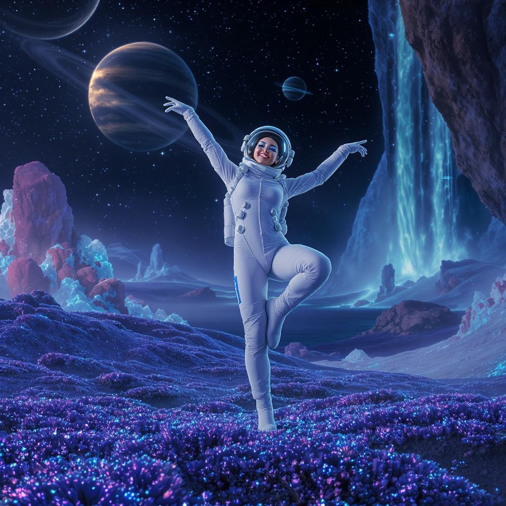 A captivating image of a graceful astronaut with a beaming smile, characterized by perfect eyes, set against an enchanting alien landscape. The scene captures the essence of a cinematic masterpiece, with stunning lighting that highlights the astronaut's childlike wonder. The backdrop features a surreal setting, echoing the imaginative style of a fantastical painting. While the focus is on the astronaut's joyful dance, the landscape adds a touch of mystery and beauty to the composition.
