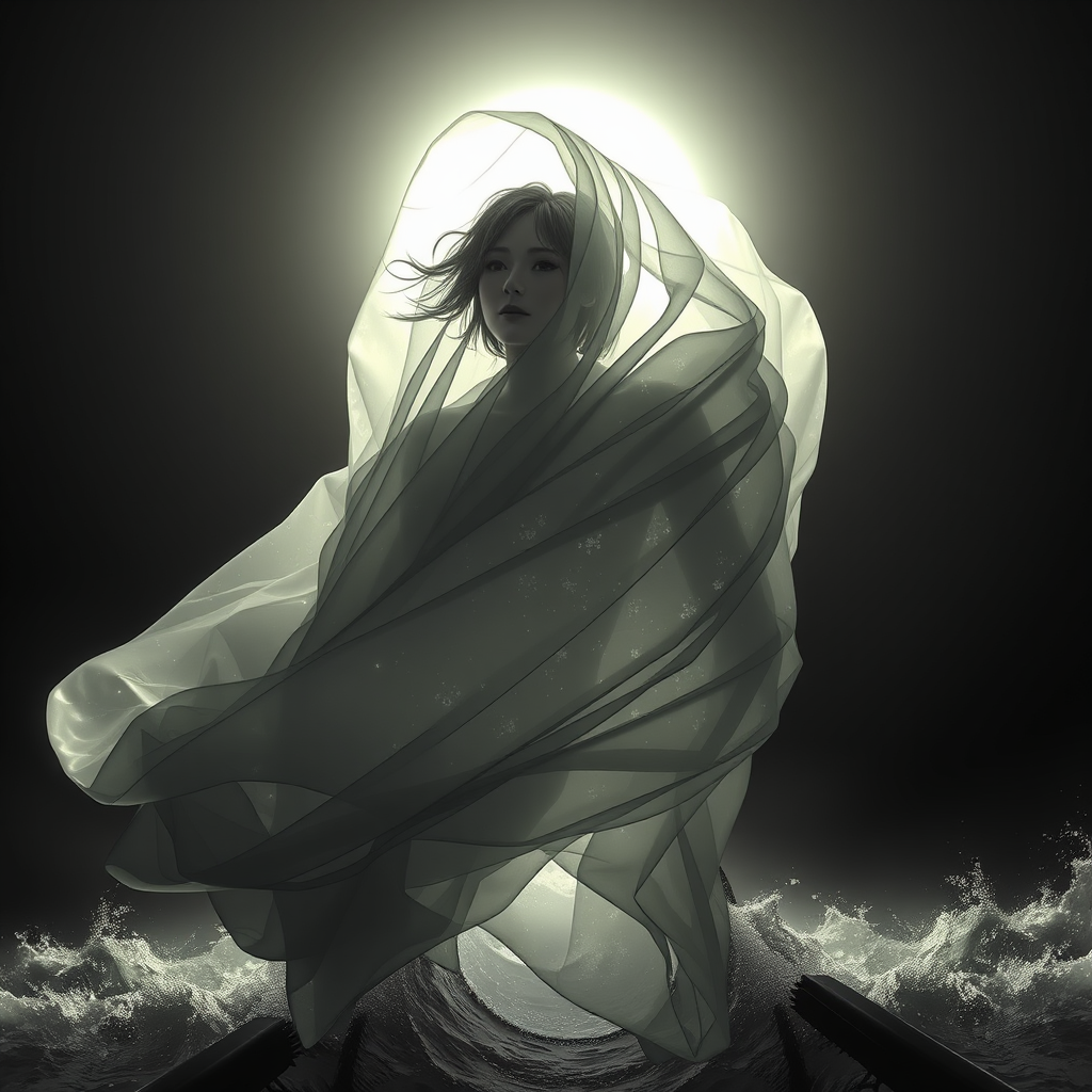 Image d'une personne enveloppée dans un matériau semblable à un linceul, se fondant naturellement avec l'air environnant. Le contraste entre le fond obscur et la texture éclatante et brillante du matériau crée une impression d'émergence ou de transformation. Les nuances monochromes accentuent l'atmosphère mystérieuse et intense, évoquant une sensation de flottement et de mystère. À côté, une navigation ultra réaliste d'un voilier usé par le temps, illuminé par une lumière dramatique d'un lever de soleil pâle. La scène est cinématographique, vue sous un angle bas, avec une attention extrême aux détails et à la texture. L'œuvre est une fusion entre une création artistique de Studio Ghibli et l'art complexe de John William Turner, marquée par son style distinctif, comme si elle était conçue avec le moteur Unreal Engine 5, offrant une expérience visuelle captivante et quasi-surréaliste.