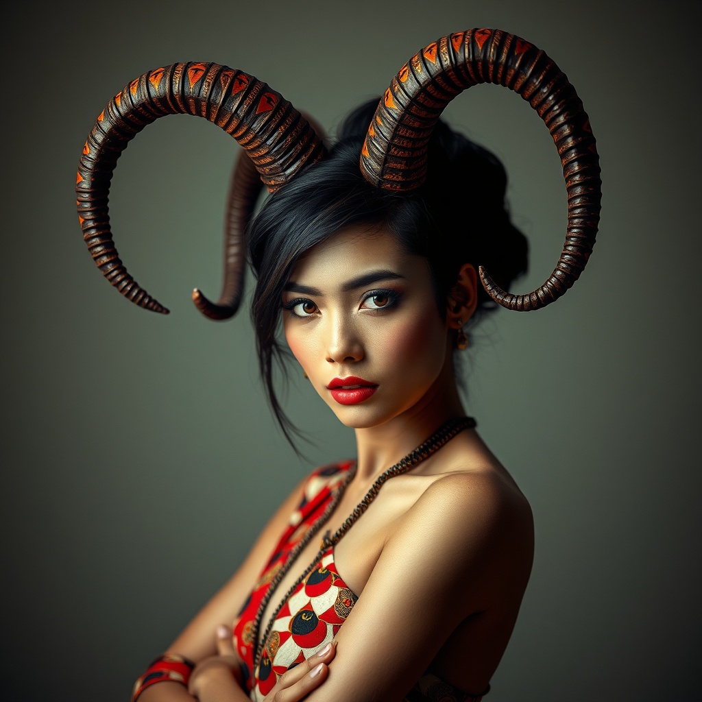 A vibrant image of a woman elegantly posing with intricately crafted horns adorned on her head, capturing the essence of contemporary cultural fusion. The visual style evokes the innovative spirit of Brian Jungen, with textural depth and nuanced composition reminiscent of Steven Meisel's photography. Rich, bold colors interplay with subtle shadowing, casting an ethereal aura around her poised figure. Her attire blends traditional motifs with modern elements, creating a striking contrast against the minimalist background, emphasizing the artwork's raw, unfiltered aesthetic.