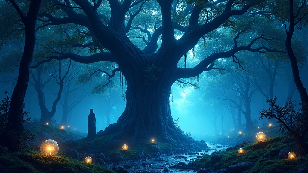 View this AI-generated image featuring a captivating image of a mystical forest with a central ancient tree enshrouded by an ethereal wraith crafted in a visionary otherworldly style the setting is adorned with spherical sculptures casting a serene light in shades of azure and deep indigo the scene
