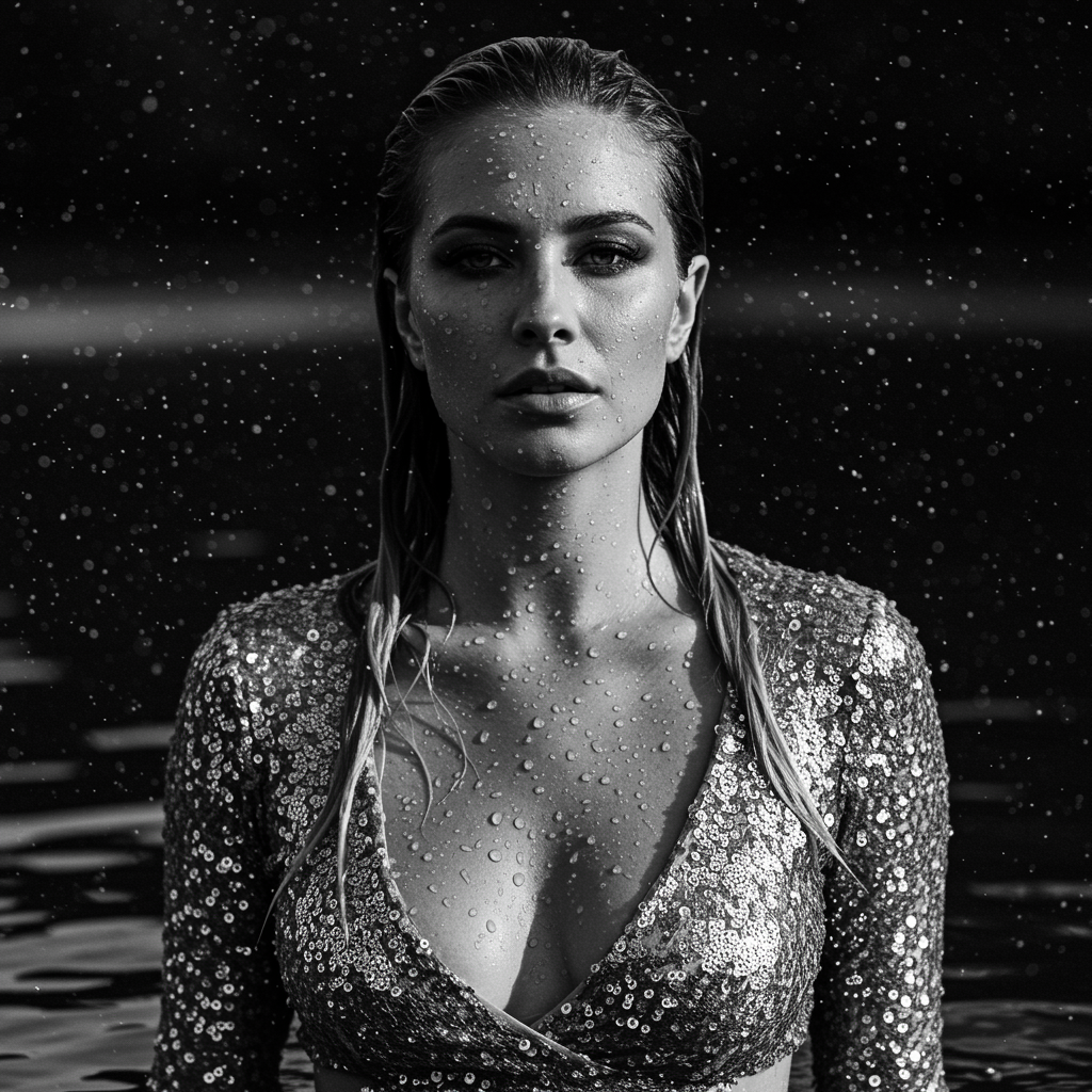 View this AI-generated image featuring a monochrome image featuring a woman immersed in water reminiscent of the style of mert and marcus adorned with shimmering droplets on her skin modelled by kristine froseth the composition captures a likeness to carola rubio wearing a sequin top frameless the s