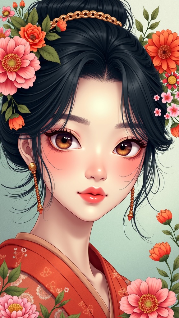 View this AI-generated image featuring a striking image of a stunning japanese girl adorned with an array of vibrant blossoming flowers exuding the enchanting essence of cottagecore the artwork embraces the distinctive style of artgerm featuring a blend of loose yet expressive linework and richly de