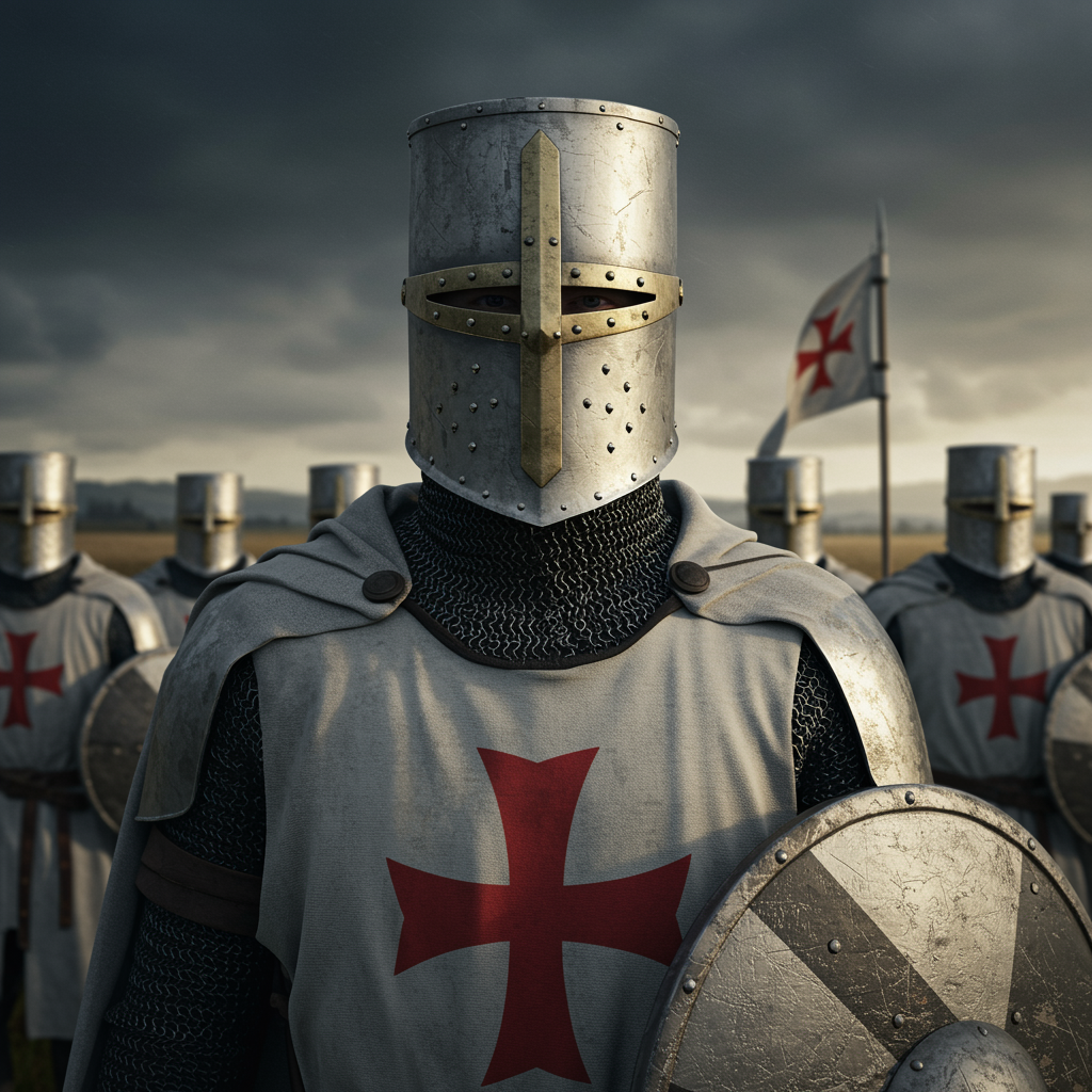 A detailed and lifelike image of a Templar knight's armor and helmet, featuring a pristine white tunic adorned with a bold red cross on the chest. The knight stands resolutely in formation among fellow warriors, their unified presence suggesting the anticipation of an impending battle. The landscape behind them is a vast, open battlefield under a brooding grey sky, evoking a sense of tension and impending conflict. A subtle depth of field effect gently blurs the horizon, drawing focus to the intricate details of the armor and the determined expressions of the knights. The image captures this moment with the warmth and intimacy that a 50mm lens provides, while introducing a hint of artistry to the realism with a slightly stylized finish, adding a touch of character to the scene.