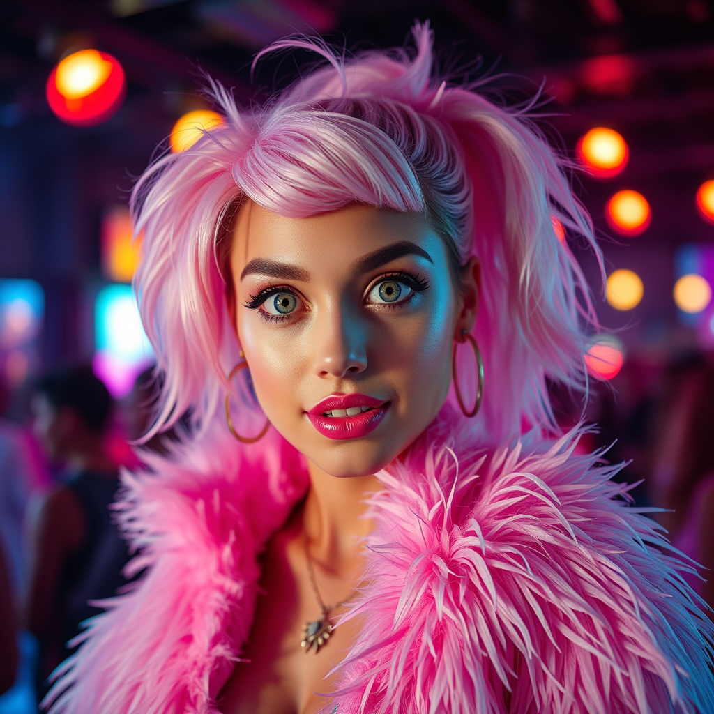 Image of a carefree woman in a vibrant rave party outfit featuring a feathered jacket, pastel pink hair styled in a quirky fashion, wide expressive eyes, bathed in colorful party lights. The setting is indoors with a high saturation palette, capturing a dreamy ambiance. The focus is soft, highlighting hyper-detailed textures and elements, complemented by cinematic lighting to create a lively, dynamic atmosphere, embodying the essence of concept art.