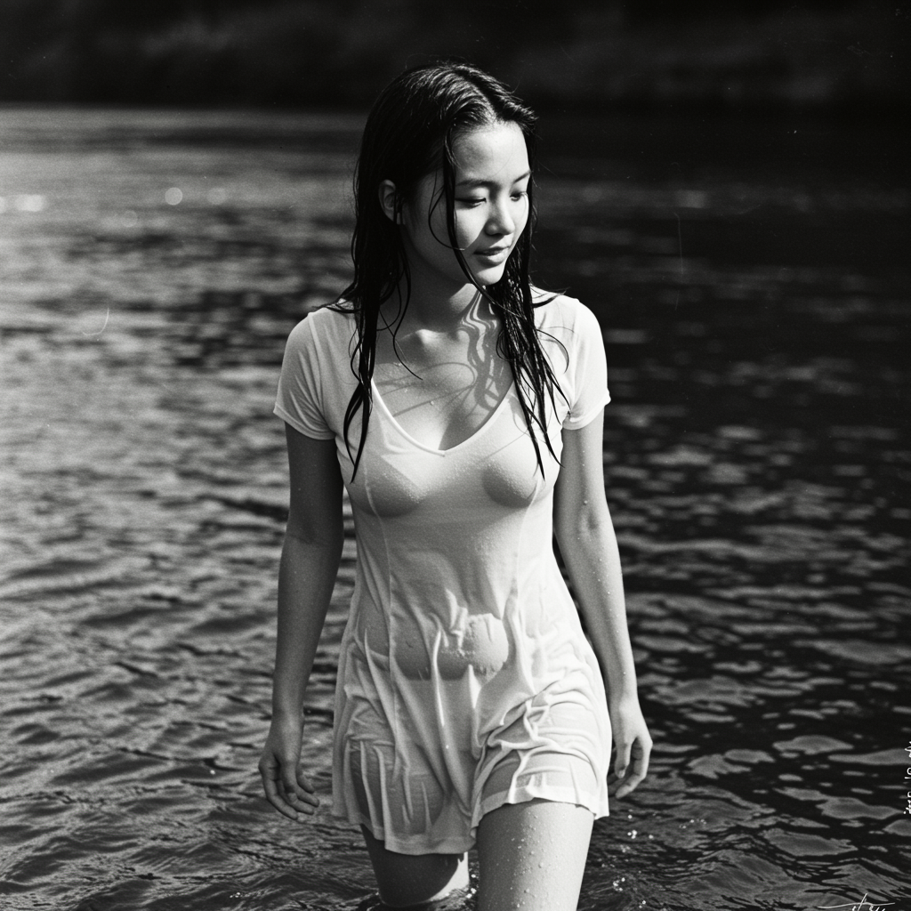 Image of a charming young woman wading through river waters, wearing a soaked white mini dress, her dark wet hair cascading down, captured during daylight hours. The scene is shot on Ilford HP5 film, showcasing a monochrome aesthetic with intense blacks, pronounced depth of field, and rich film grain. Shadows play across her features, highlighted by the natural lighting. The photo includes a discreet watermark and artist's signature. The subject is of Asian descent, with a serene and focused expression.