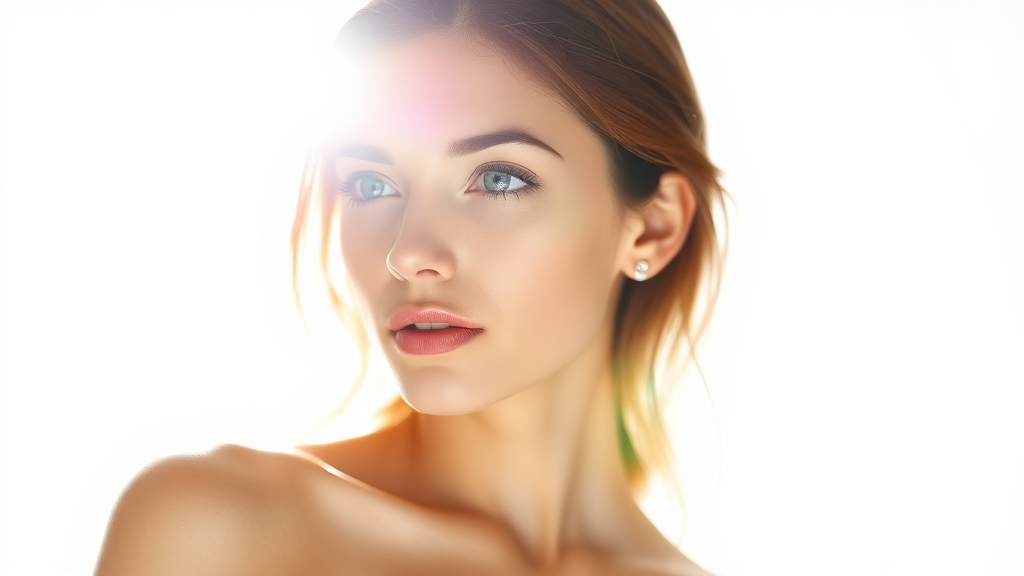 Image of a female model against a bright white backdrop, soft flares gently illuminating her features, creating a dreamy, ethereal effect; the model appears almost translucent, blending seamlessly with the light, maintaining a captivating elegance.
