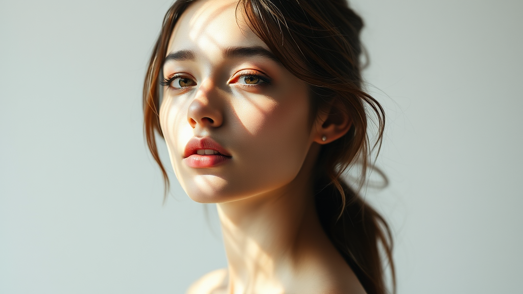 Image of a female model on a seamless white backdrop, light flares dancing across her face, ethereal and mysterious, aspect ratio 4:5, subtle creative enhancements, maintaining a raw and unfiltered aesthetic.