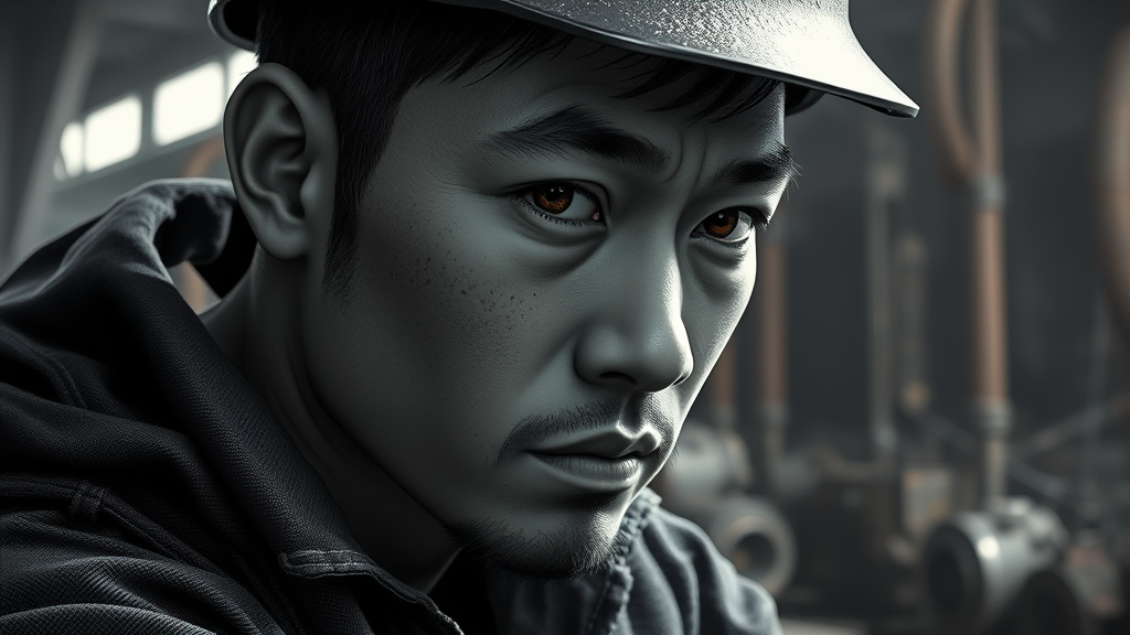 image of a strikingly beautiful artwork for a man set in a soft, lustrous, industrial mechanic world; featuring a fantastic location with a rugged, challenging work environment. It showcases a full-body action shot of a worker, captured in an 8k unity render with detailed skin pores and an intricate iris. The scene is defined by very dark lighting with heavy shadows, highlighting the detailed face. The artwork is a digital painting done in octane render style, fit for artstation and concept art, with a smooth, sharp focus illustration. Influenced by the styles of Artgerm, WLOP, and Ilya Kuvshinov, it portrays an Asian character in black and white. The image is a close-up, cartoon-like 3d render, dressed in denim, yet avoids any blurry, lackluster, or poor quality elements. The piece is free of signatures, letters, watermarks, mutations, and artifacts, ensuring it remains high quality and uncropped.