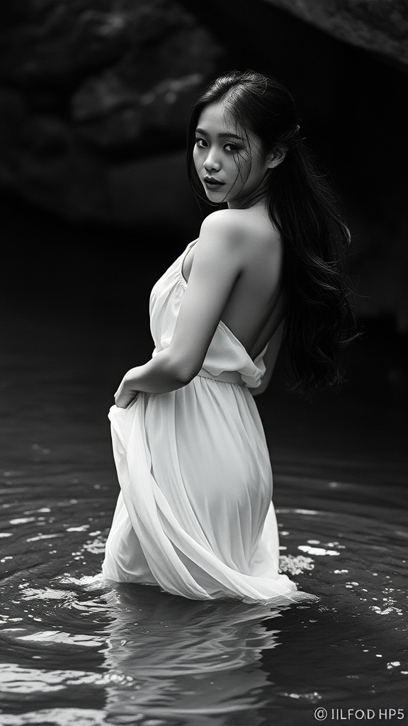 Image of a young woman gracefully emerging from a river, her wet white dress clinging to her form, hair damp and cascading over her shoulders, captured in daylight. The photograph evokes the tonal qualities of Ilford HP5 film, with rich black and white contrasts, emphasizing deep blacks and soft depth of field. The scene is slightly dark, accentuated by natural light, film grain, and shadows. It features an artistic watermark and signature. The subject, of Asian descent, possesses a serene yet mysterious allure, subtly abstracted with an imaginative touch.