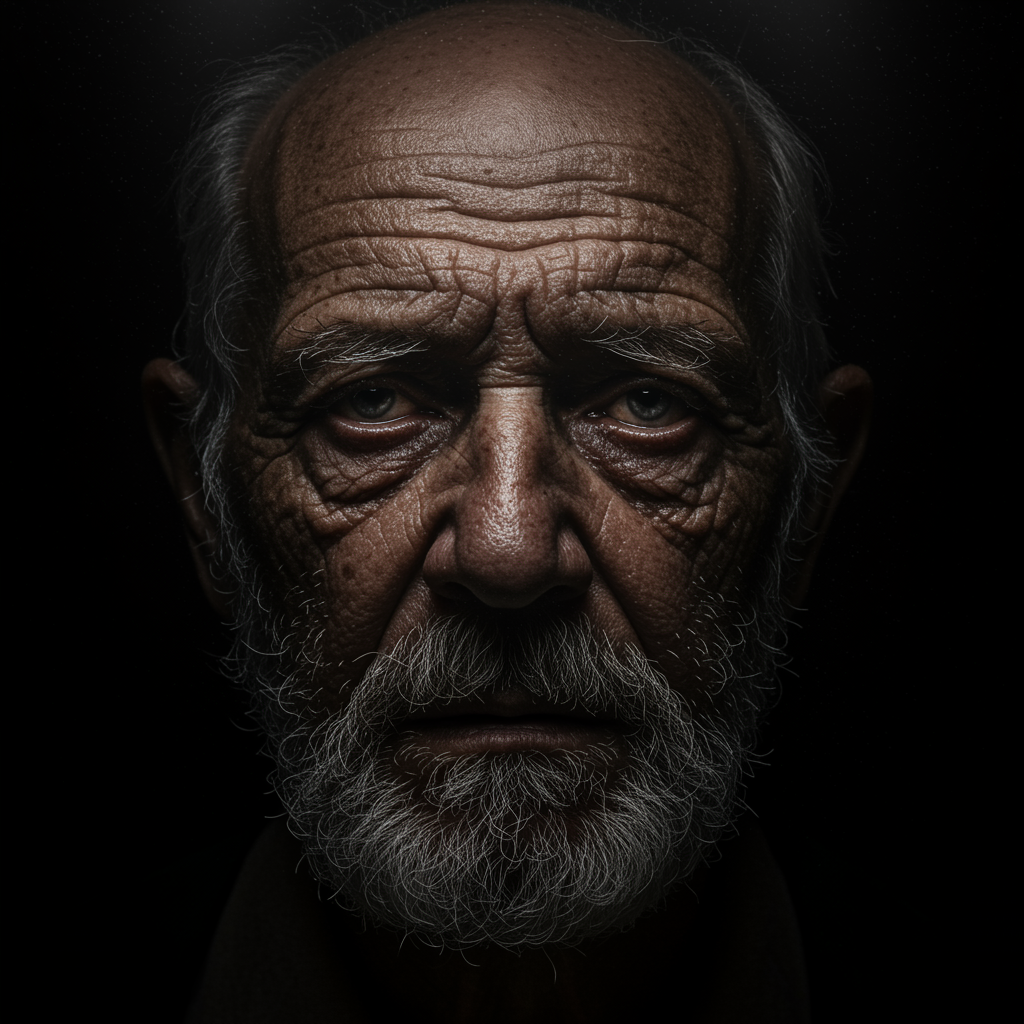 A somber image of a weary old man with a deeply lined face, set against a stark black background. His eyes, though tired, shine with a profound wisdom that speaks of countless experiences and the test of time. Every wrinkle tells a story, every grey strand is a testament to his journey. The subtle play of shadows and light accentuates his features, highlighting the contrast between age and dignity. Slight rays of muted light cast a gentle halo around him, adding an air of quiet resilience and introspection to the scene, capturing the essence of enduring wisdom in ultra-high definition detail.